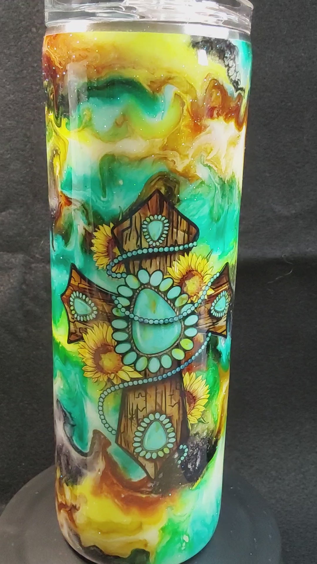 20 oz skinny with turquoise yellow and brown swirls with a wooden cross decal